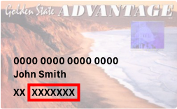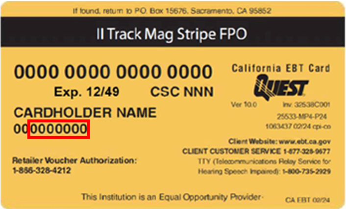 Front of EBT card showing 2 characters and then a red box around the next 7 characters under a name.